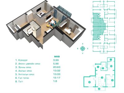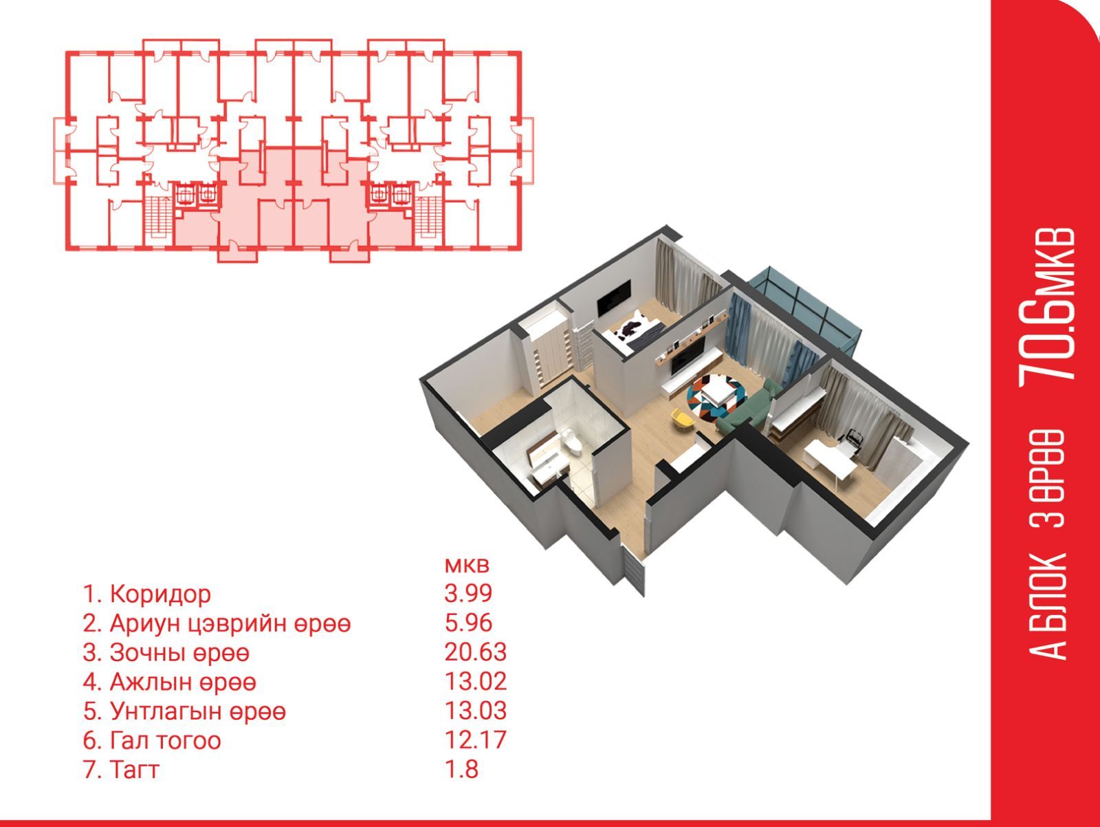 Унтлагын өрөө, зочны хэсэг болон гал тогоо нь нэг дор шийдэгдсэн тул талбайг бүрэн ашиглах боломжтой. Өрөөний зохион байгуулалт нь гэрэлтүүлэг, байгалийн гэрлийг оновчтой ашигласан бөгөөд оршин суугчдад тав тух, дулаан уур амьсгал мэдрүүлнэ. Энэхүү орон сууц нь залуу хосууд болон ганц бие хүмүүст тохиромжтой бөгөөд хотын амьдралд хялбар, энгийн шийдэлтэй амьдрах орон зайг санал болгож байна.