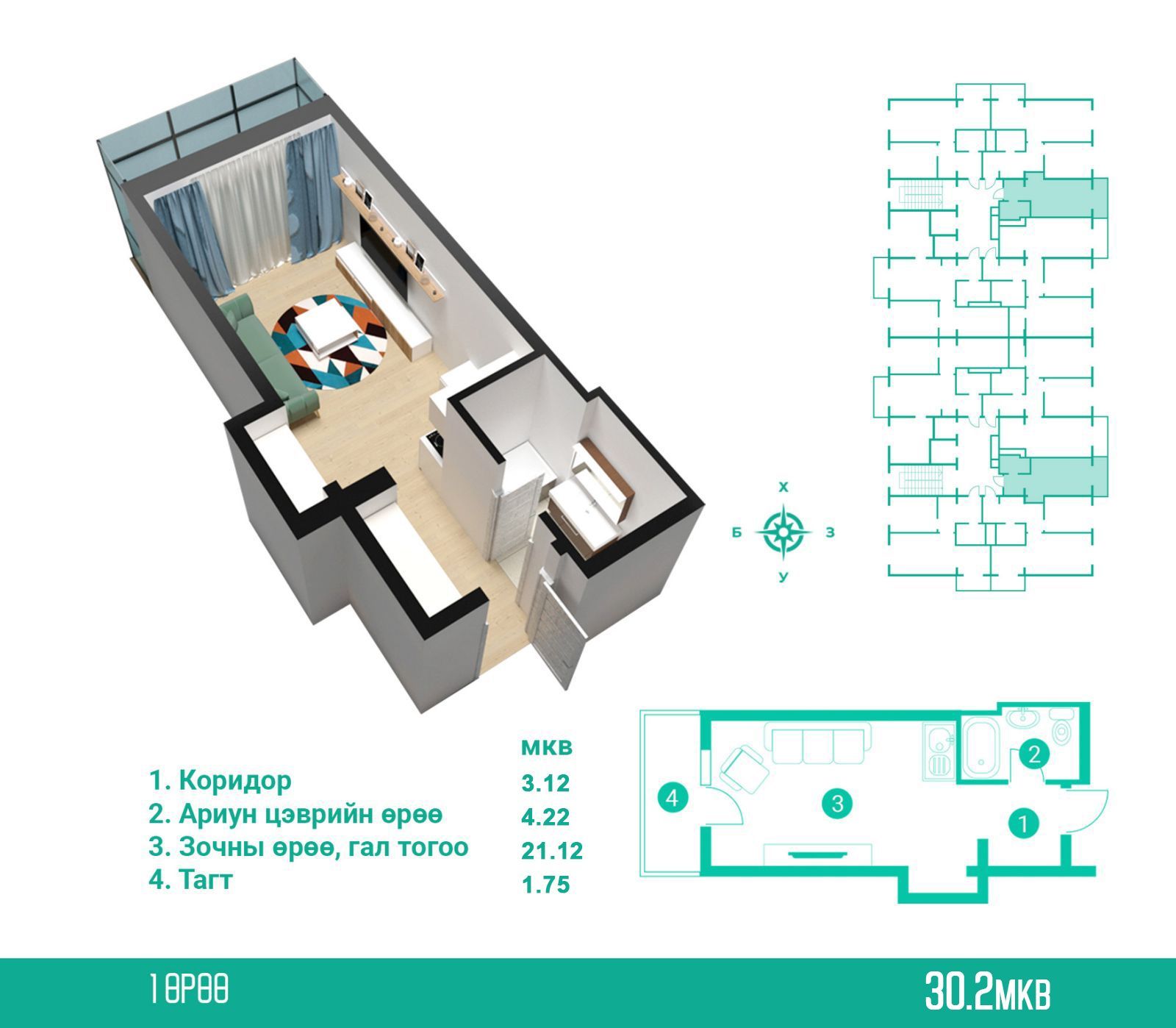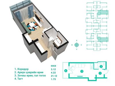 Унтлагын өрөө, зочны хэсэг болон гал тогоо нь нэг дор шийдэгдсэн тул талбайг бүрэн ашиглах боломжтой. Өрөөний зохион байгуулалт нь гэрэлтүүлэг, байгалийн гэрлийг оновчтой ашигласан бөгөөд оршин суугчдад тав тух, дулаан уур амьсгал мэдрүүлнэ. Энэхүү орон сууц нь залуу хосууд болон ганц бие хүмүүст тохиромжтой бөгөөд хотын амьдралд хялбар, энгийн шийдэлтэй амьдрах орон зайг санал болгож байна.