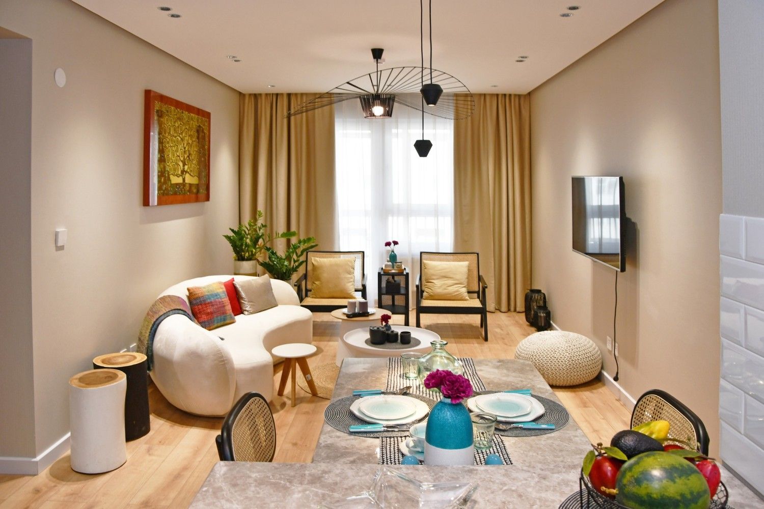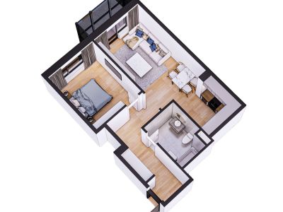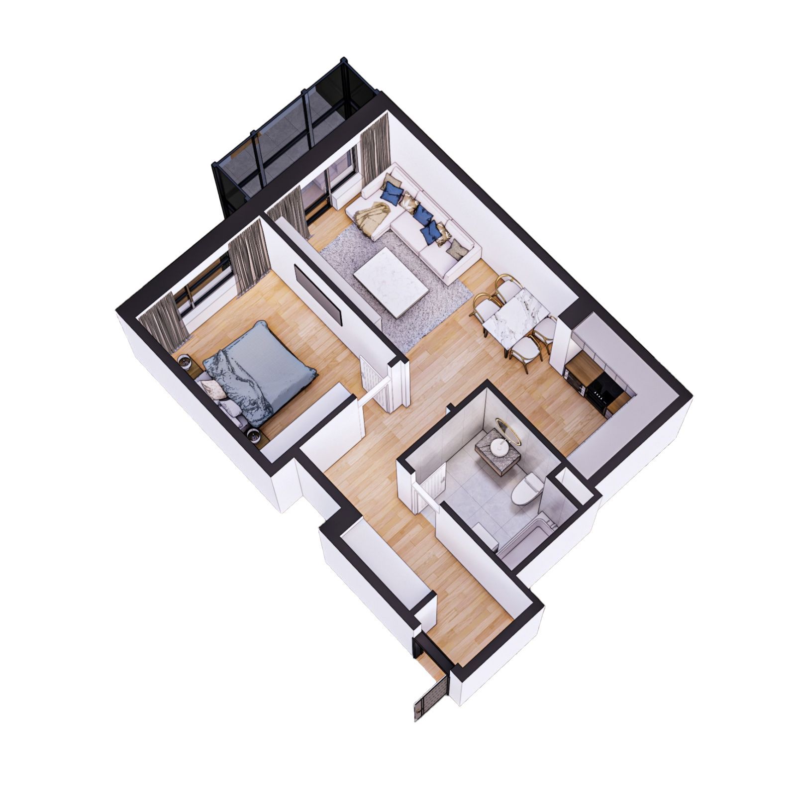 Унтлагын өрөө, зочны хэсэг болон гал тогоо нь нэг дор шийдэгдсэн тул талбайг бүрэн ашиглах боломжтой. Өрөөний зохион байгуулалт нь гэрэлтүүлэг, байгалийн гэрлийг оновчтой ашигласан бөгөөд оршин суугчдад тав тух, дулаан уур амьсгал мэдрүүлнэ. Энэхүү орон сууц нь залуу хосууд болон ганц бие хүмүүст тохиромжтой бөгөөд хотын амьдралд хялбар, энгийн шийдэлтэй амьдрах орон зайг санал болгож байна.