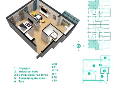| 3,4 | Зочны өрөө, гал тогоо | 28.26м² |